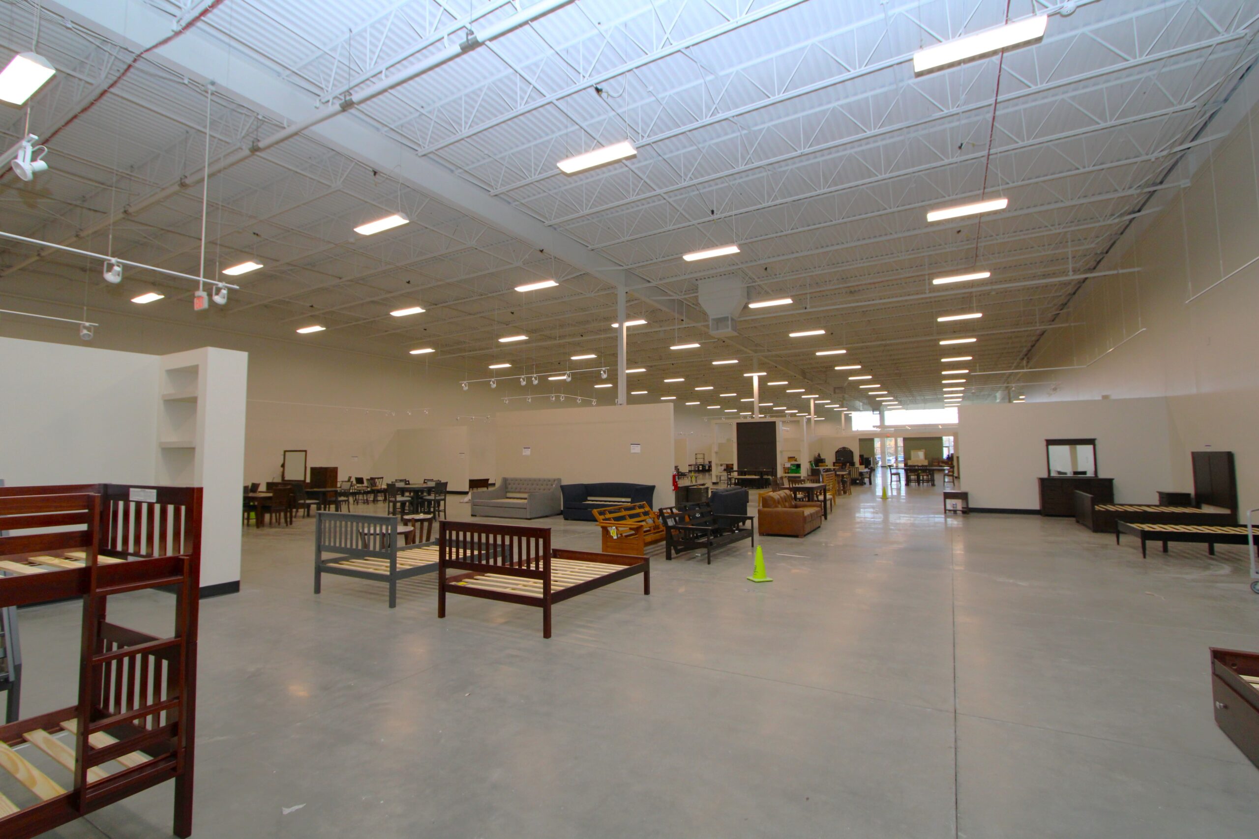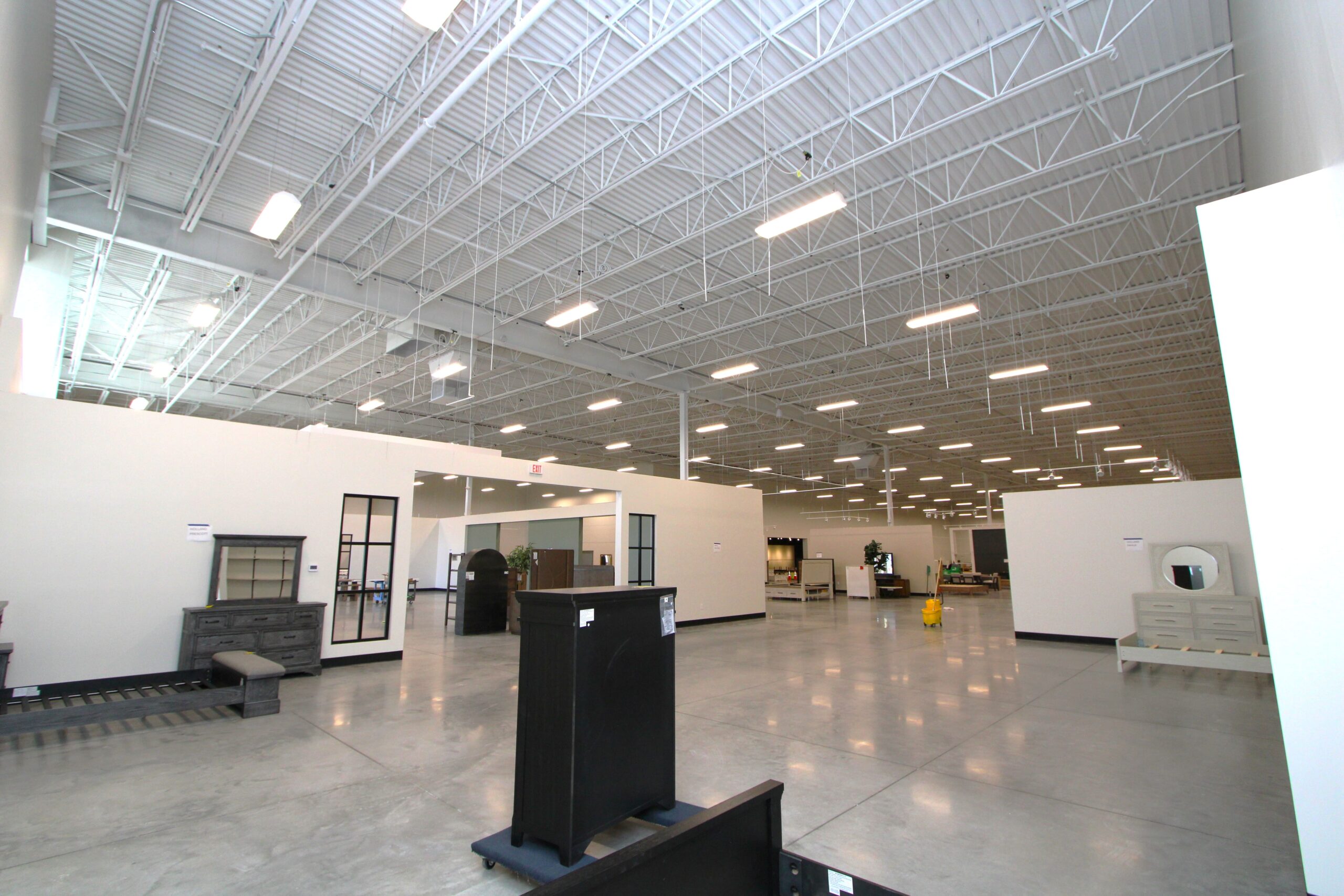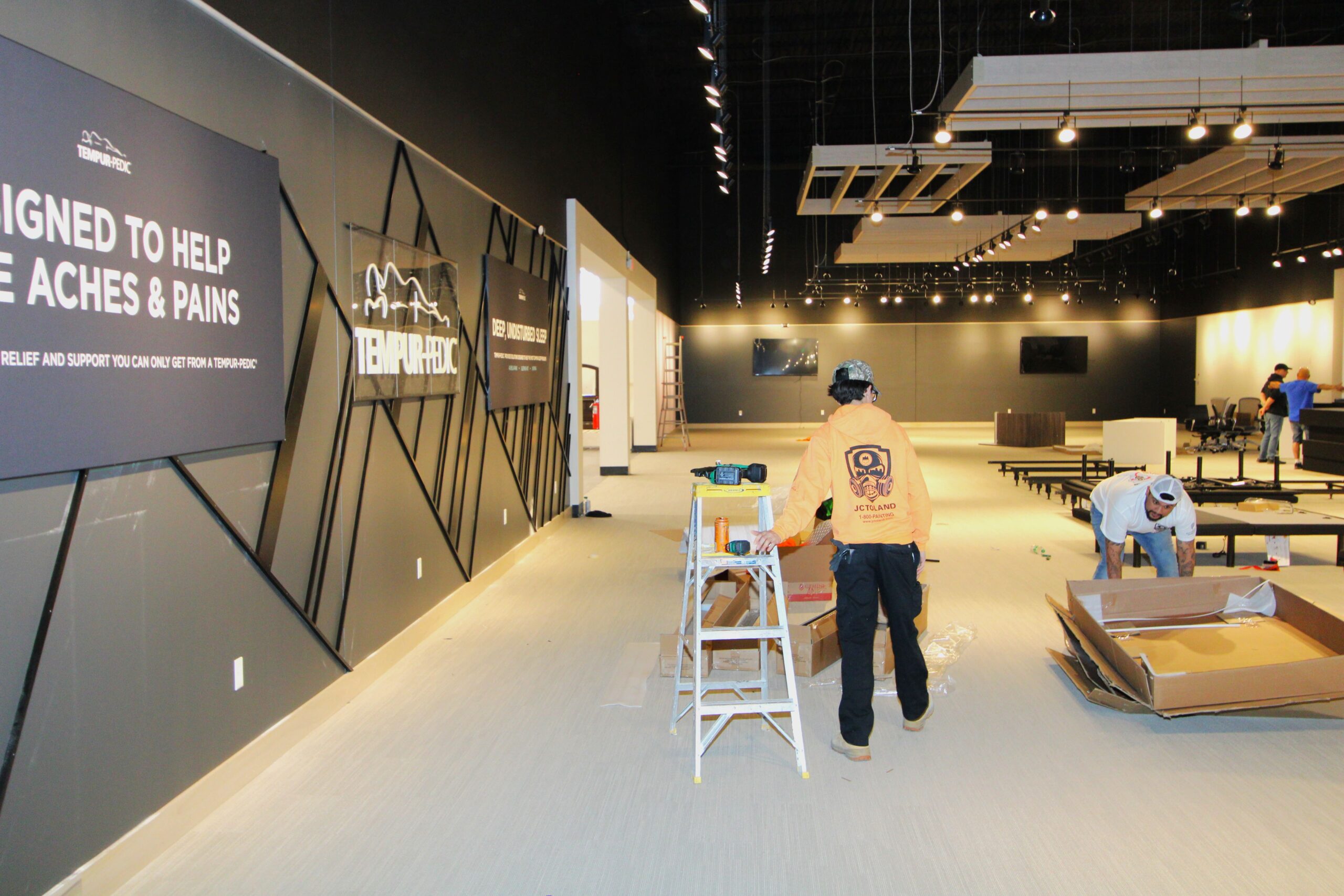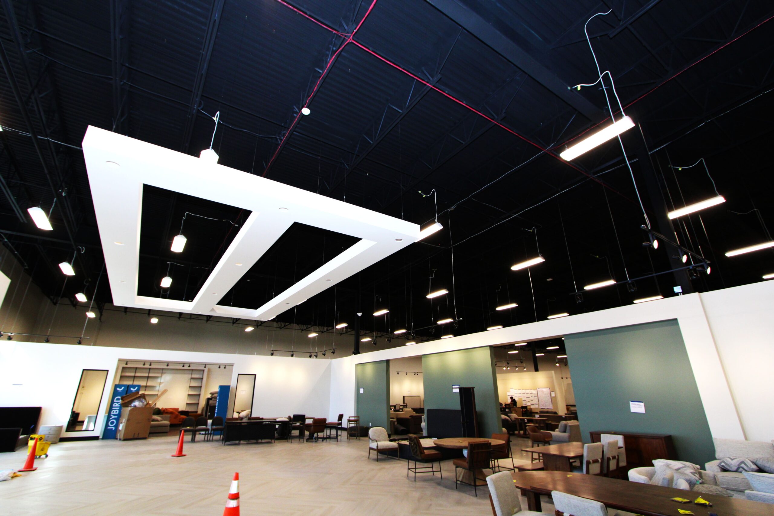 The new Ashley Furniture Store has finished up in Ames, IA! Starting at the beginning of 2025, and finishing just before the end of 2025, JC Toland made a massive impact on this massive warehouse and show-room that is now opened up to the public. Boasting a foot-print of over 90,000 square feet, this new commercial storefront is now one of the largest in the City of Ames.Our role in this job was significant to say the least. We performed all of the priming and painting throughout, which included 90,000+ sq ft of ceiling deck and coating the 20’ tall walls throughout (and all the offices, restrooms, vestibules, showroom floor accent walls, etc). We performed all the drywall hanging and finishing throughout–installing sheetrock, applying mud, sanding and skimming every seam and screwhole throughout. We built all the walls inside–with the awarded contract for all metal-stud framing throughout the facility. And we were also in charge of setting all grid and installing all acoustic ceiling tiles throughout. Pictured below, you’ll see some of our finish carpenters working through the aesthetic finish touches in the mattress showroom; as well as one of our foreman finishing the ACT in one of the front offices. The decorative hanging framing/drywall sections were all built-out and installed by our team as well.