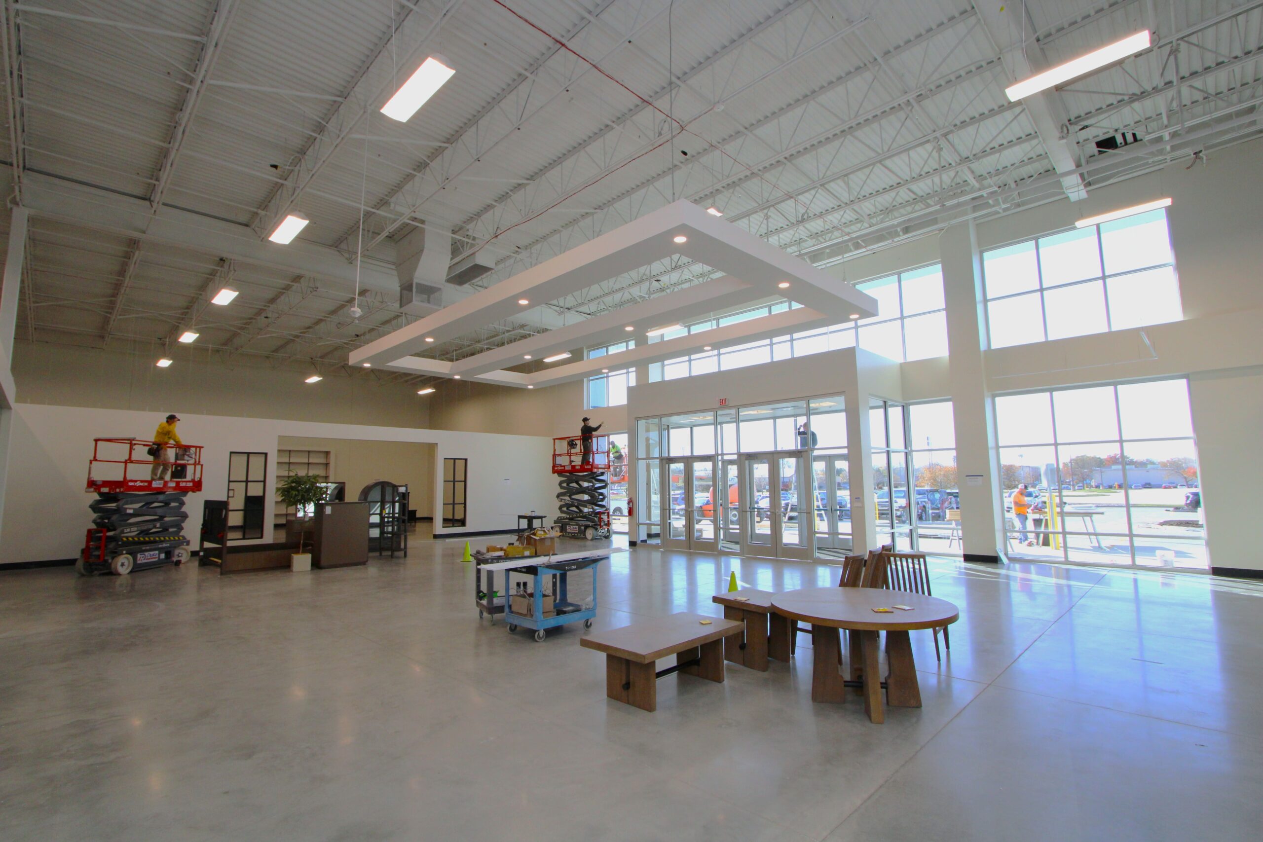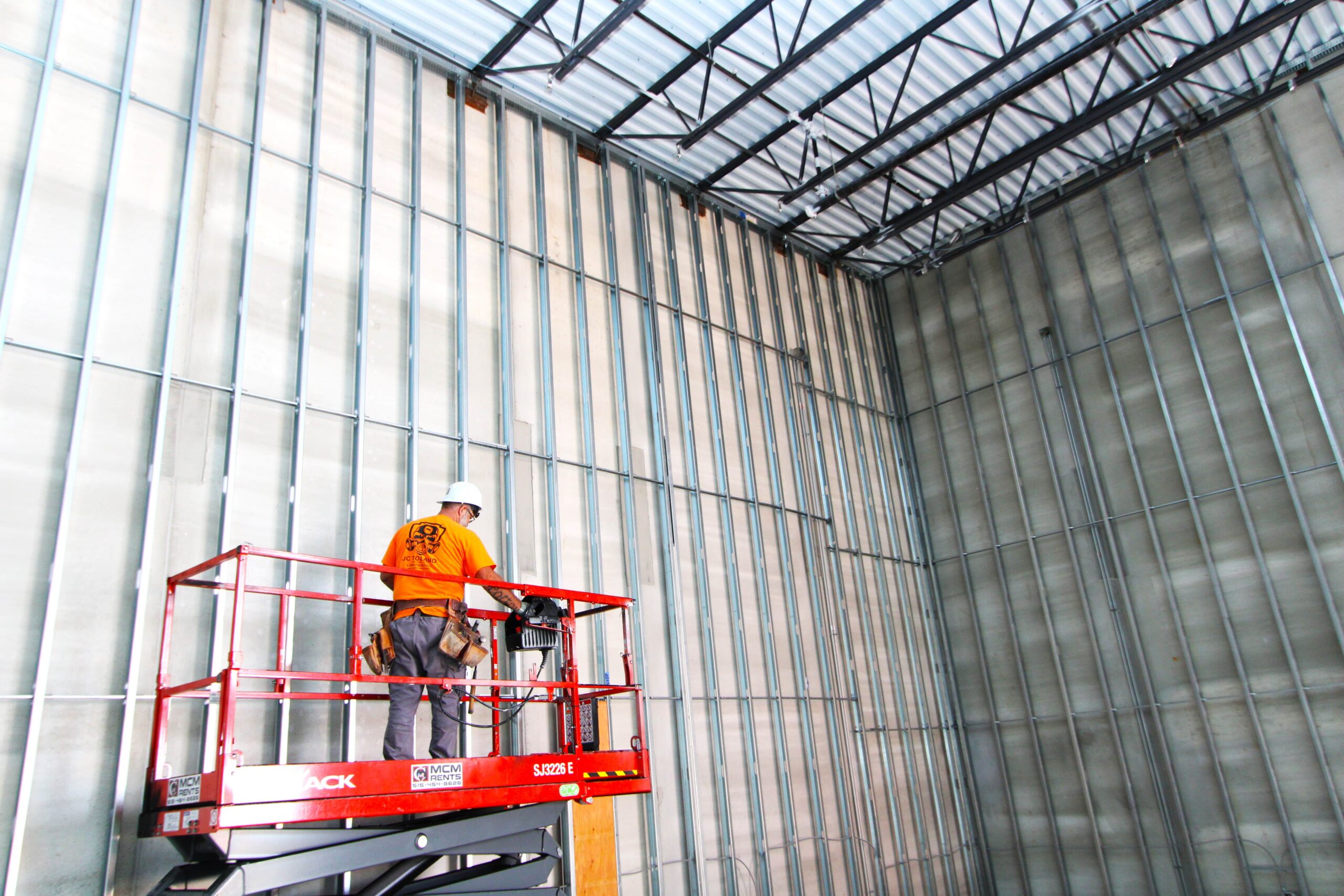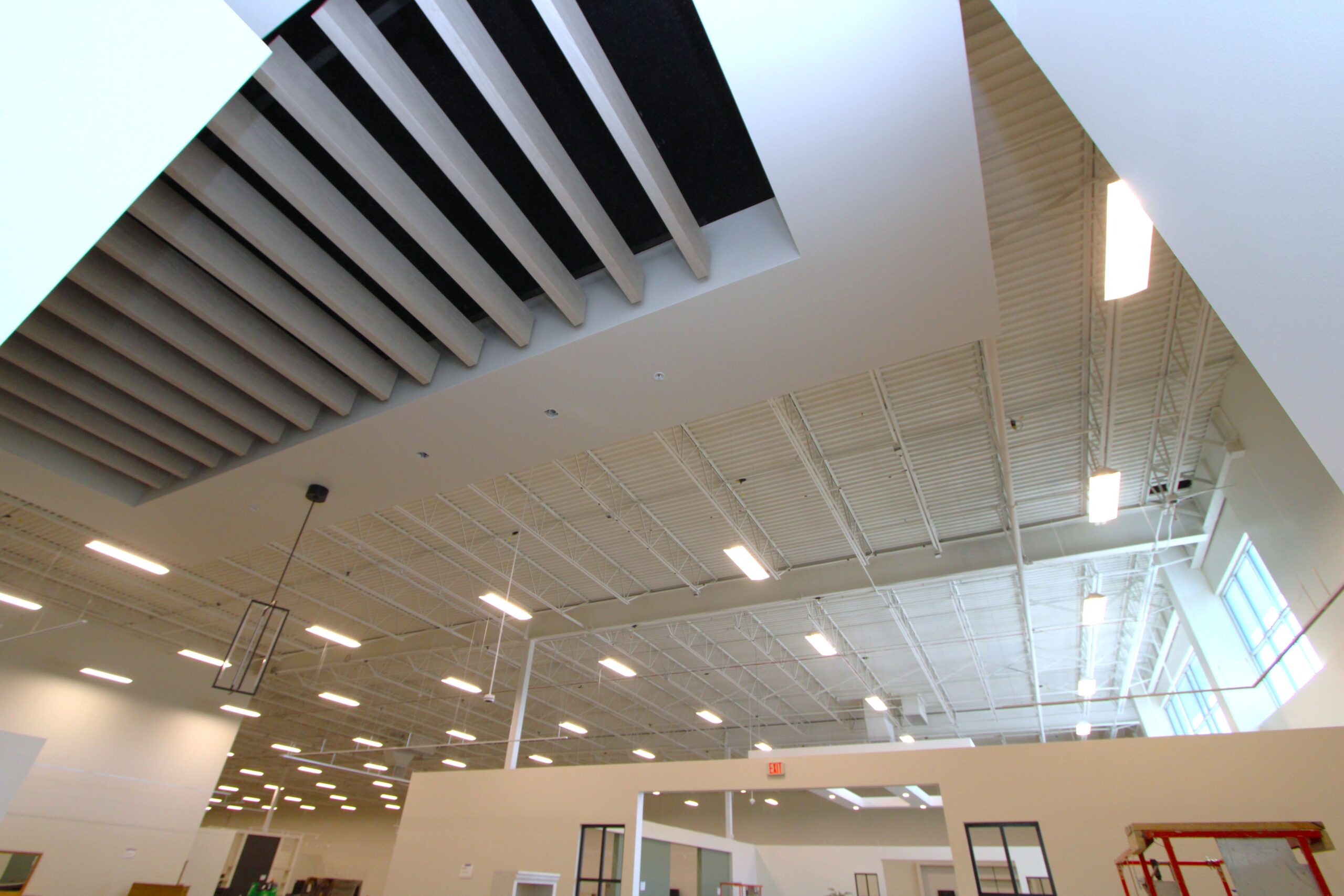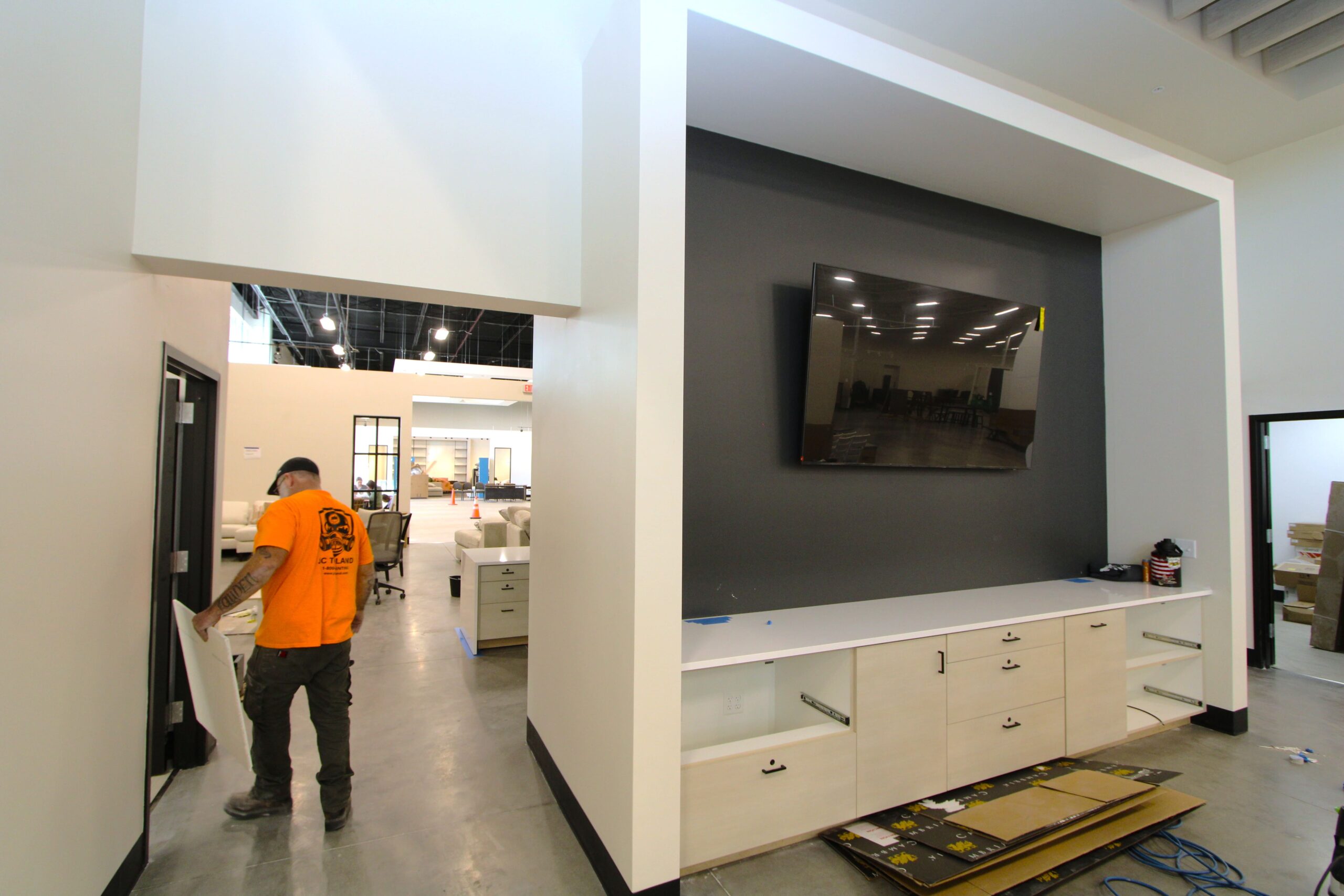 The new Ashley Furniture Store has finished up in Ames, IA! Starting at the beginning of 2025, and finishing just before the end of 2025, JC Toland made a massive impact on this massive warehouse and show-room that is now opened up to the public. Boasting a foot-print of over 90,000 square feet, this new commercial storefront is now one of the largest in the City of Ames.Our role in this job was significant to say the least. We performed all of the priming and painting throughout, which included 90,000+ sq ft of ceiling deck and coating the 20’ tall walls throughout (and all the offices, restrooms, vestibules, showroom floor accent walls, etc). We performed all the drywall hanging and finishing throughout–installing sheetrock, applying mud, sanding and skimming every seam and screwhole throughout. We built all the walls inside–with the awarded contract for all metal-stud framing throughout the facility. And we were also in charge of setting all grid and installing all acoustic ceiling tiles throughout. Pictured below, you’ll see some of our finish carpenters working through the aesthetic finish touches in the mattress showroom; as well as one of our foreman finishing the ACT in one of the front offices. The decorative hanging framing/drywall sections were all built-out and installed by our team as well.