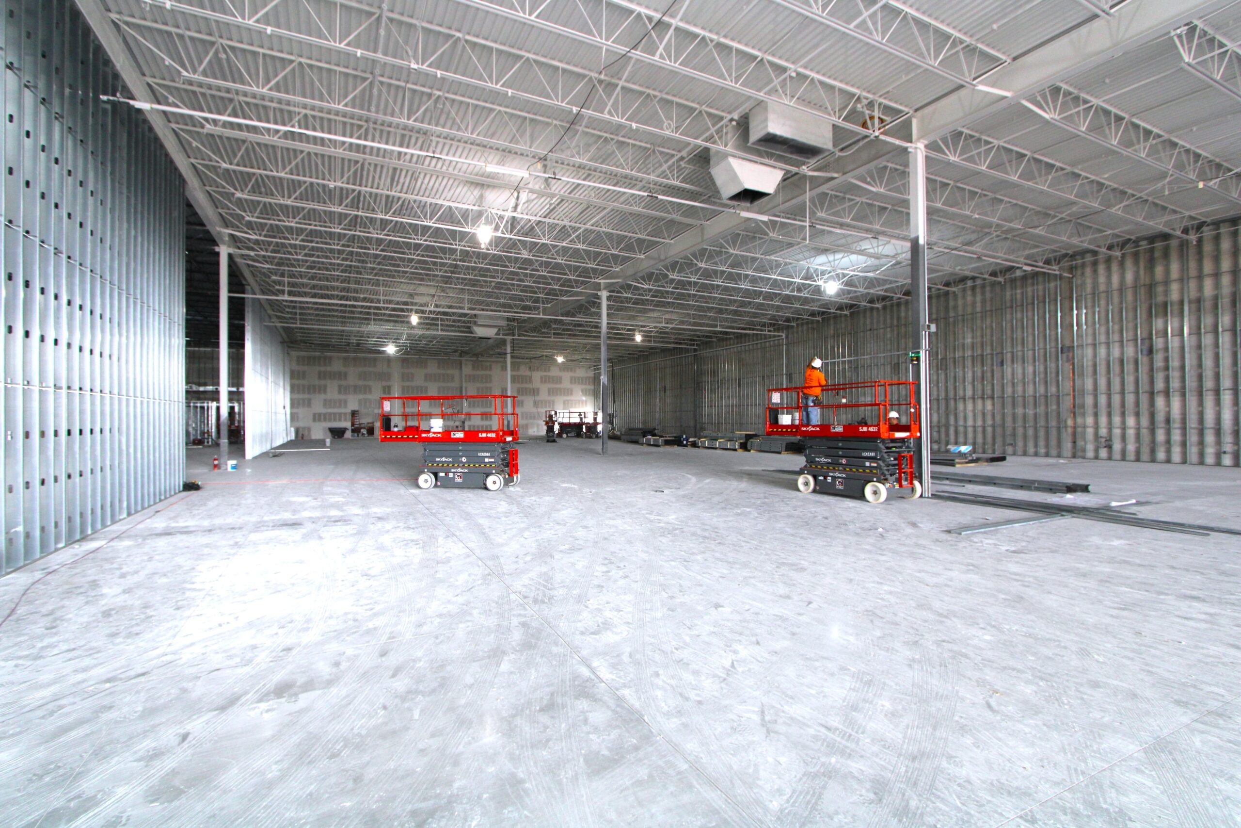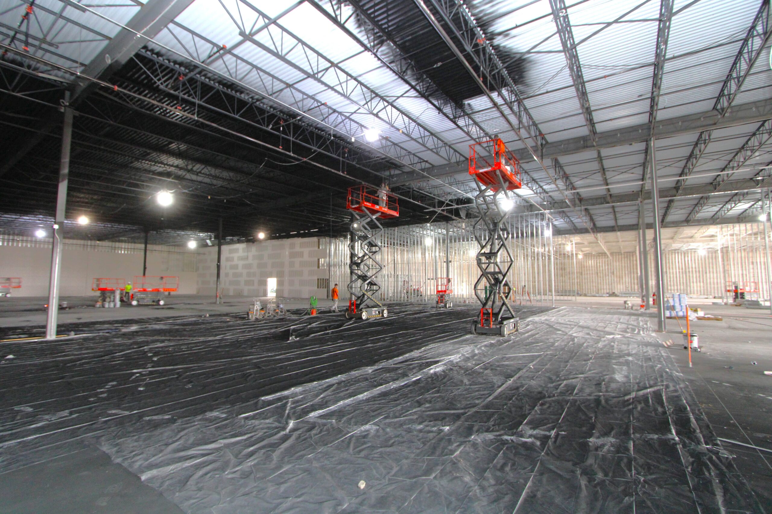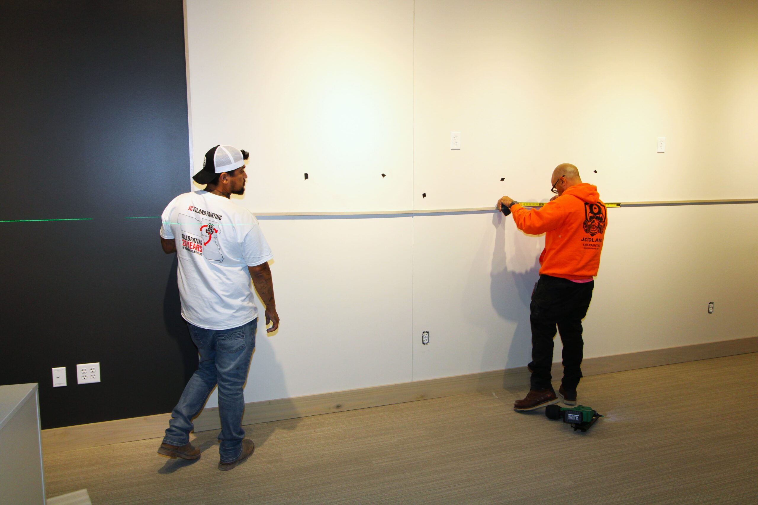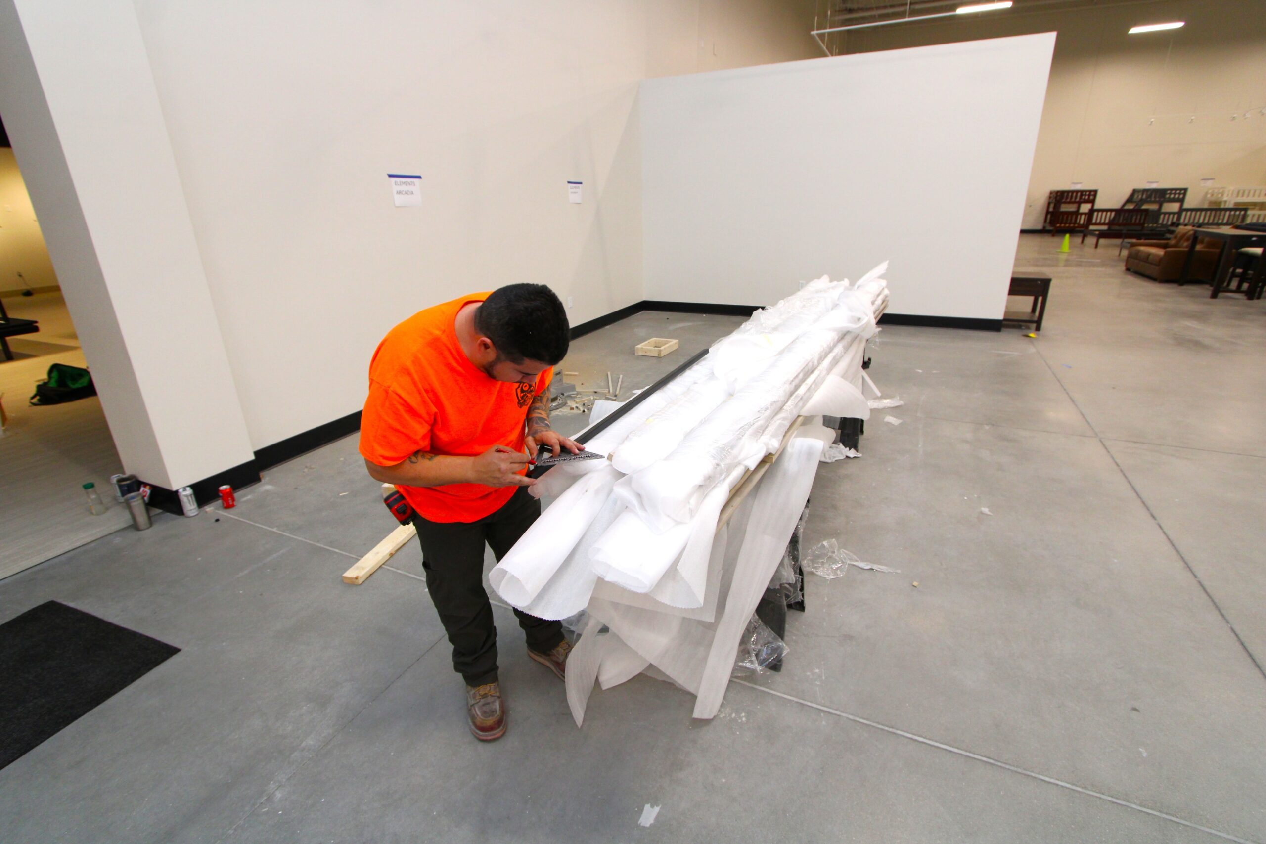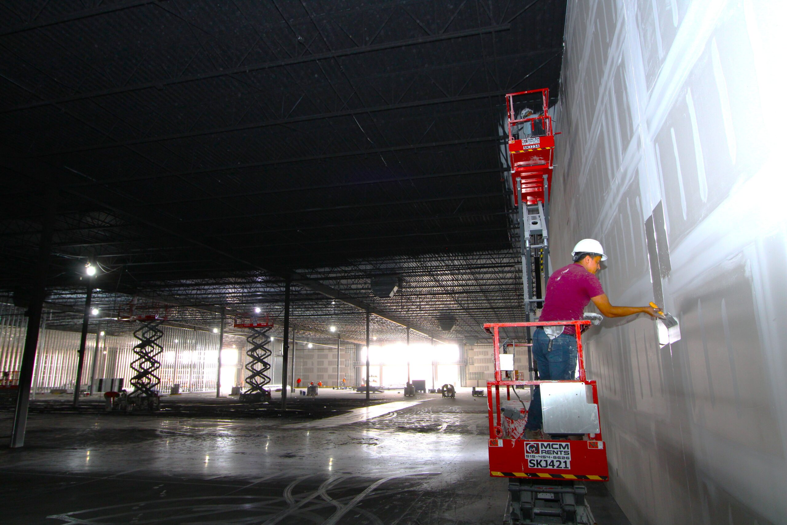 The new Ashley Furniture Store has finished up in Ames, IA! Starting at the beginning of 2025, and finishing just before the end of 2025, JC Toland made a massive impact on this massive warehouse and show-room that is now opened up to the public. Boasting a foot-print of over 90,000 square feet, this new commercial storefront is now one of the largest in the City of Ames.Our role in this job was significant to say the least. We performed all of the priming and painting throughout, which included 90,000+ sq ft of ceiling deck and coating the 20’ tall walls throughout (and all the offices, restrooms, vestibules, showroom floor accent walls, etc). We performed all the drywall hanging and finishing throughout–installing sheetrock, applying mud, sanding and skimming every seam and screwhole throughout. We built all the walls inside–with the awarded contract for all metal-stud framing throughout the facility. And we were also in charge of setting all grid and installing all acoustic ceiling tiles throughout. Pictured below, you’ll see some of our finish carpenters working through the aesthetic finish touches in the mattress showroom; as well as one of our foreman finishing the ACT in one of the front offices. The decorative hanging framing/drywall sections were all built-out and installed by our team as well.