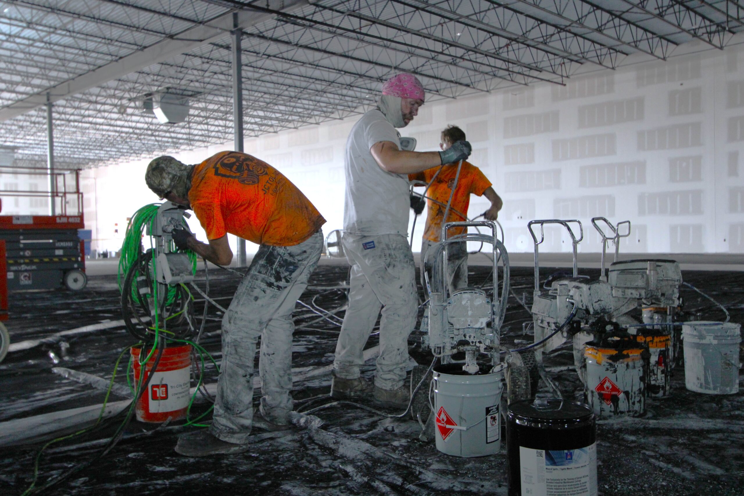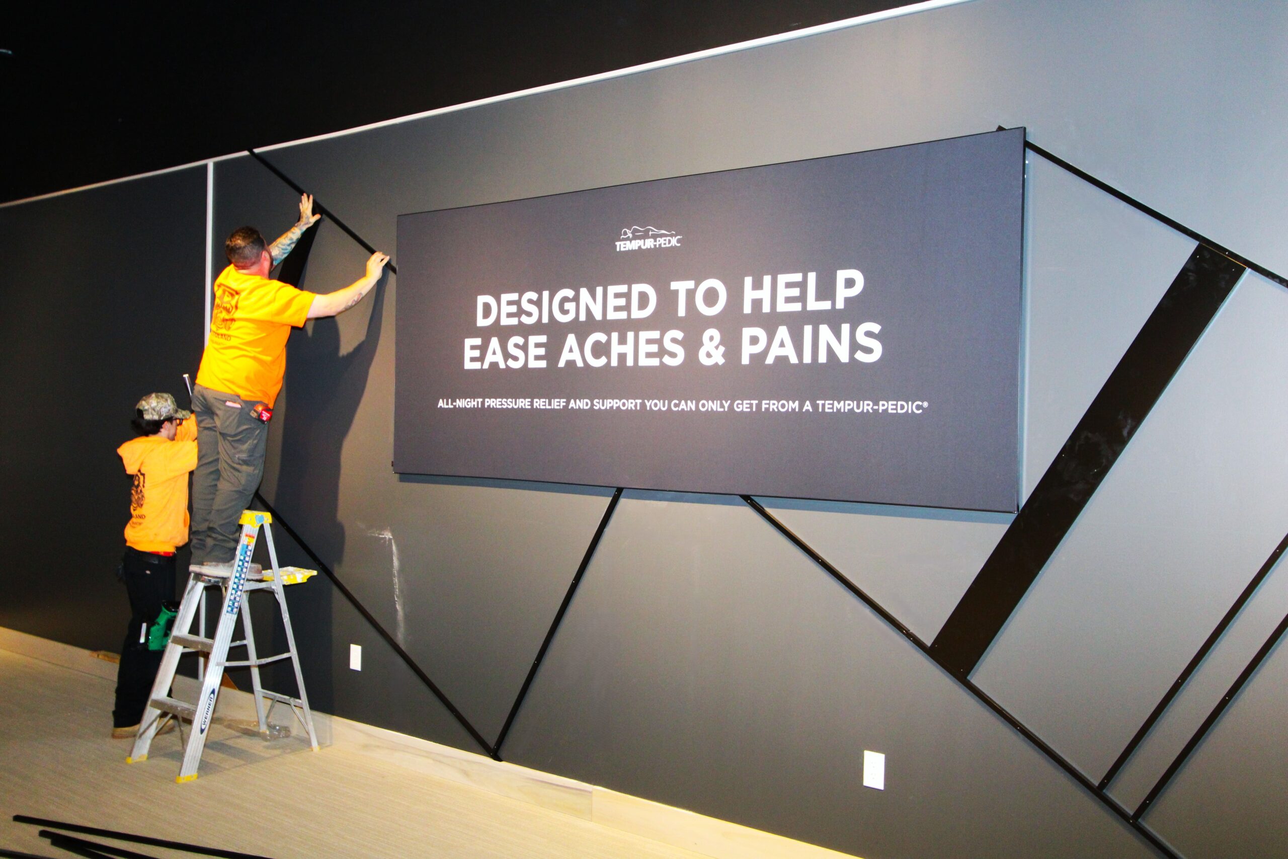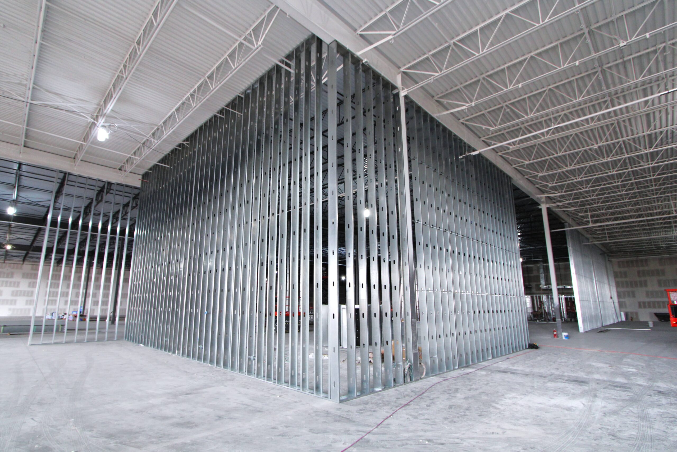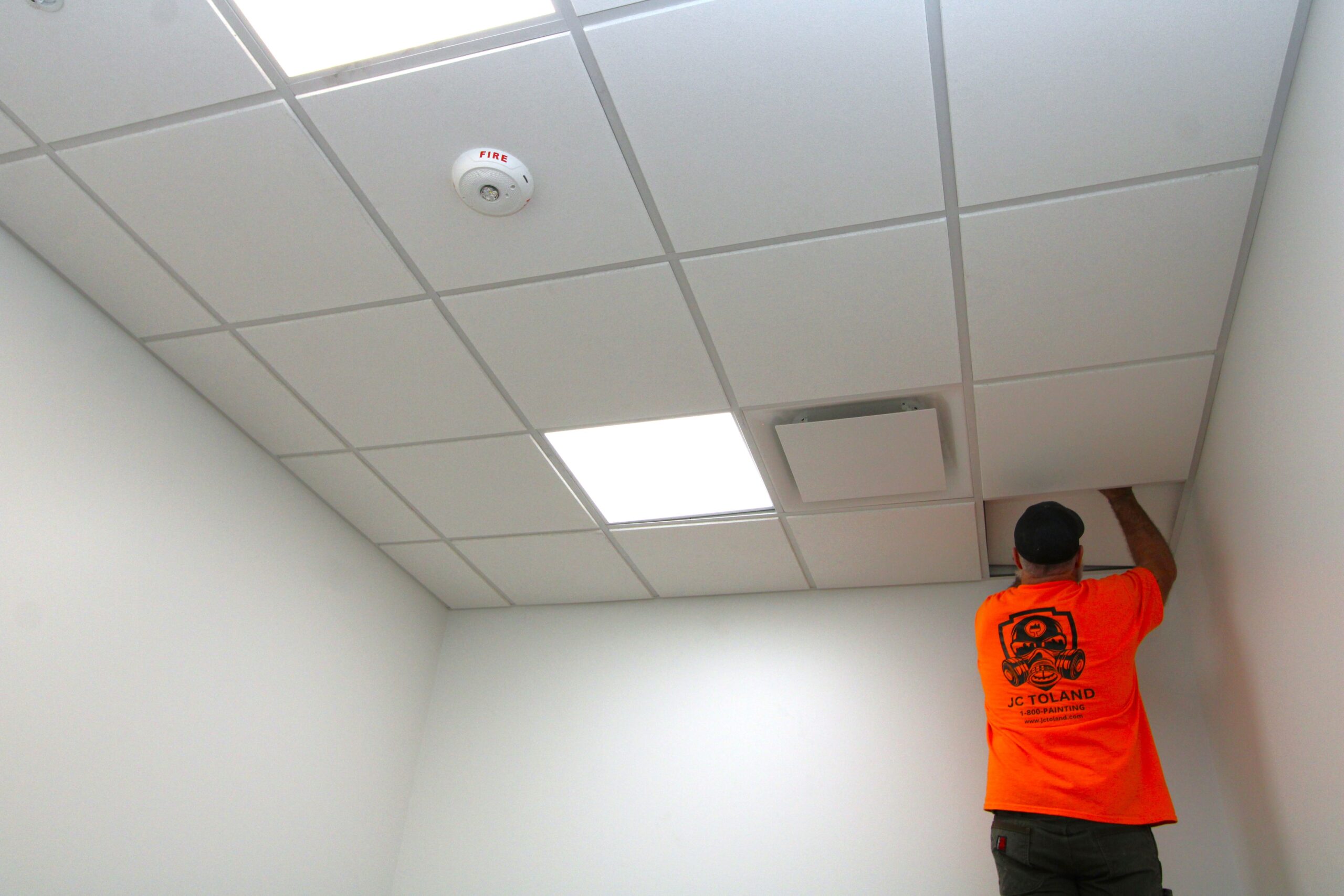 The new Ashley Furniture Store has finished up in Ames, IA! Starting at the beginning of 2025, and finishing just before the end of 2025, JC Toland made a massive impact on this massive warehouse and show-room that is now opened up to the public. Boasting a foot-print of over 90,000 square feet, this new commercial storefront is now one of the largest in the City of Ames.Our role in this job was significant to say the least. We performed all of the priming and painting throughout, which included 90,000+ sq ft of ceiling deck and coating the 20’ tall walls throughout (and all the offices, restrooms, vestibules, showroom floor accent walls, etc). We performed all the drywall hanging and finishing throughout–installing sheetrock, applying mud, sanding and skimming every seam and screwhole throughout. We built all the walls inside–with the awarded contract for all metal-stud framing throughout the facility. And we were also in charge of setting all grid and installing all acoustic ceiling tiles throughout. Pictured below, you’ll see some of our finish carpenters working through the aesthetic finish touches in the mattress showroom; as well as one of our foreman finishing the ACT in one of the front offices. The decorative hanging framing/drywall sections were all built-out and installed by our team as well.